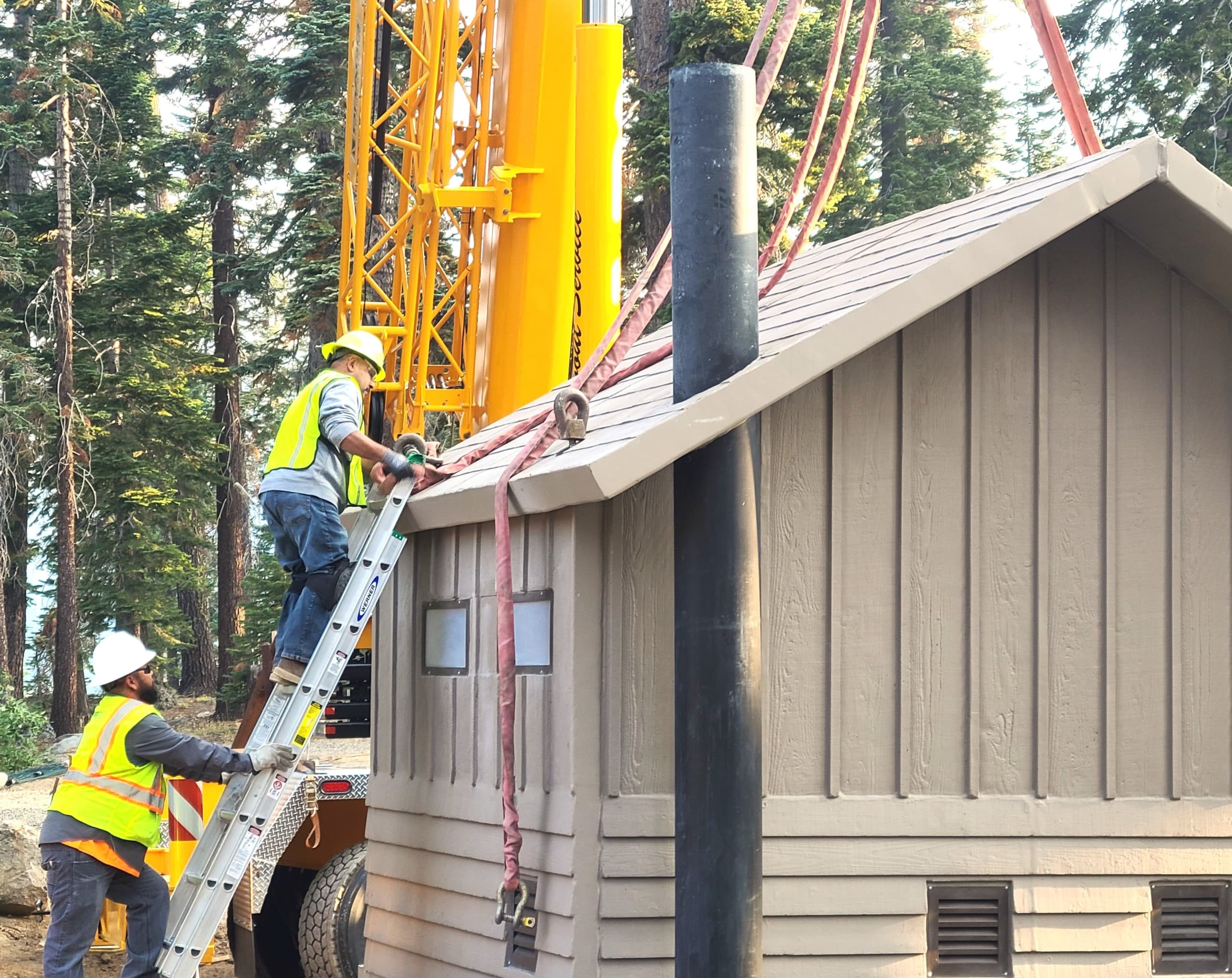 Before installing the buildings, the Jensen crew teamed up with the contractor to set the vaults and align them to ensure that the restroom installations would go smoothly. They planned to install the 10 buildings at Silver Lake Campground in just three days.