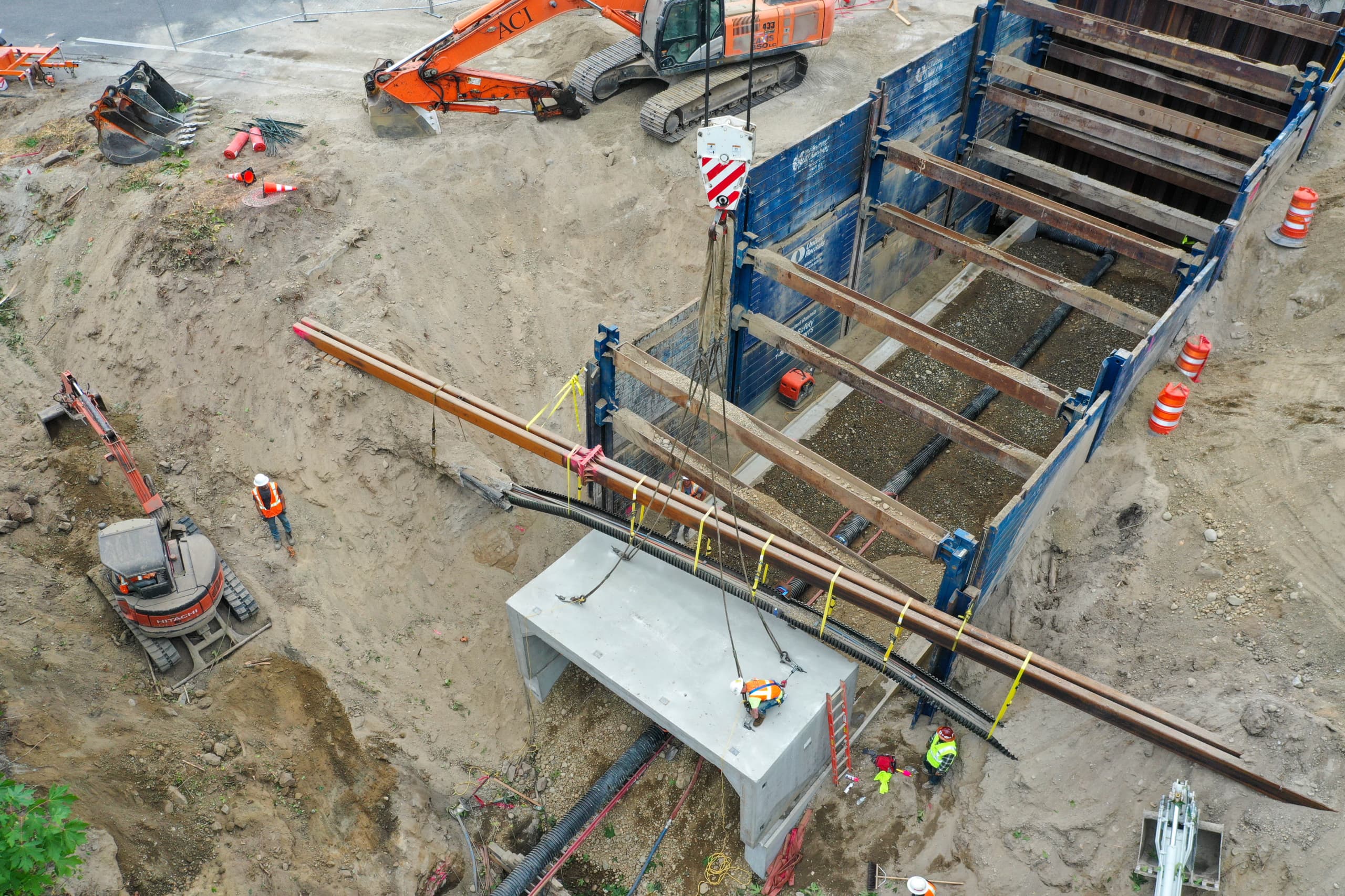 Frank Detray, ACI Superintendent, says that was just for starters. “We had a primary fiber duct on the north side that goes to the naval base near here,” he says. “They weren’t able to relocate it, so we had to work over it, under it, and around it. The south side had two water mains that we were able to remove and will put back at a later date.”