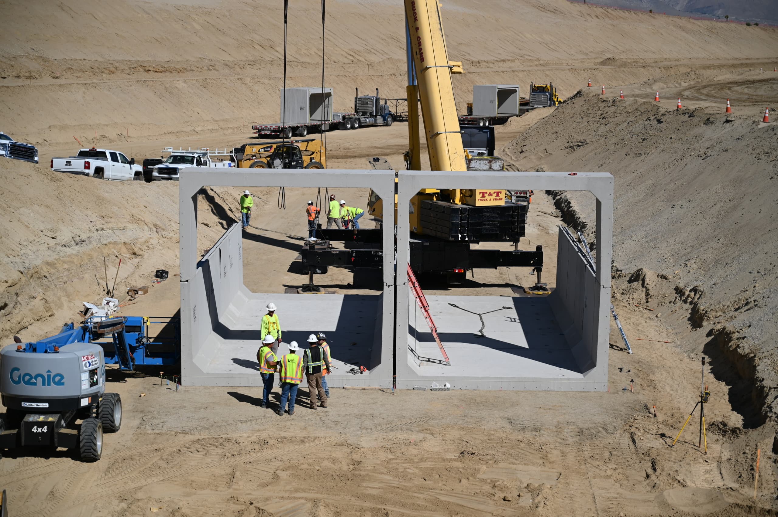 Phase two of this massive project has two steps. First, realign the Los Angeles Aqueduct. Next, create a diversion channel. The aqueduct needs to be realigned to make way for the new dam, while the diversion channel is going to be used to fill the newfound basin created between the two dams with water, increasing the reservoir’s storage capacity. However, adding a diversion channel now creates a challenge. How will construction crews cross the channel to complete the dam while still allowing water to flow freely into the basin? With a Jensen segmental Type 2 box culvert.