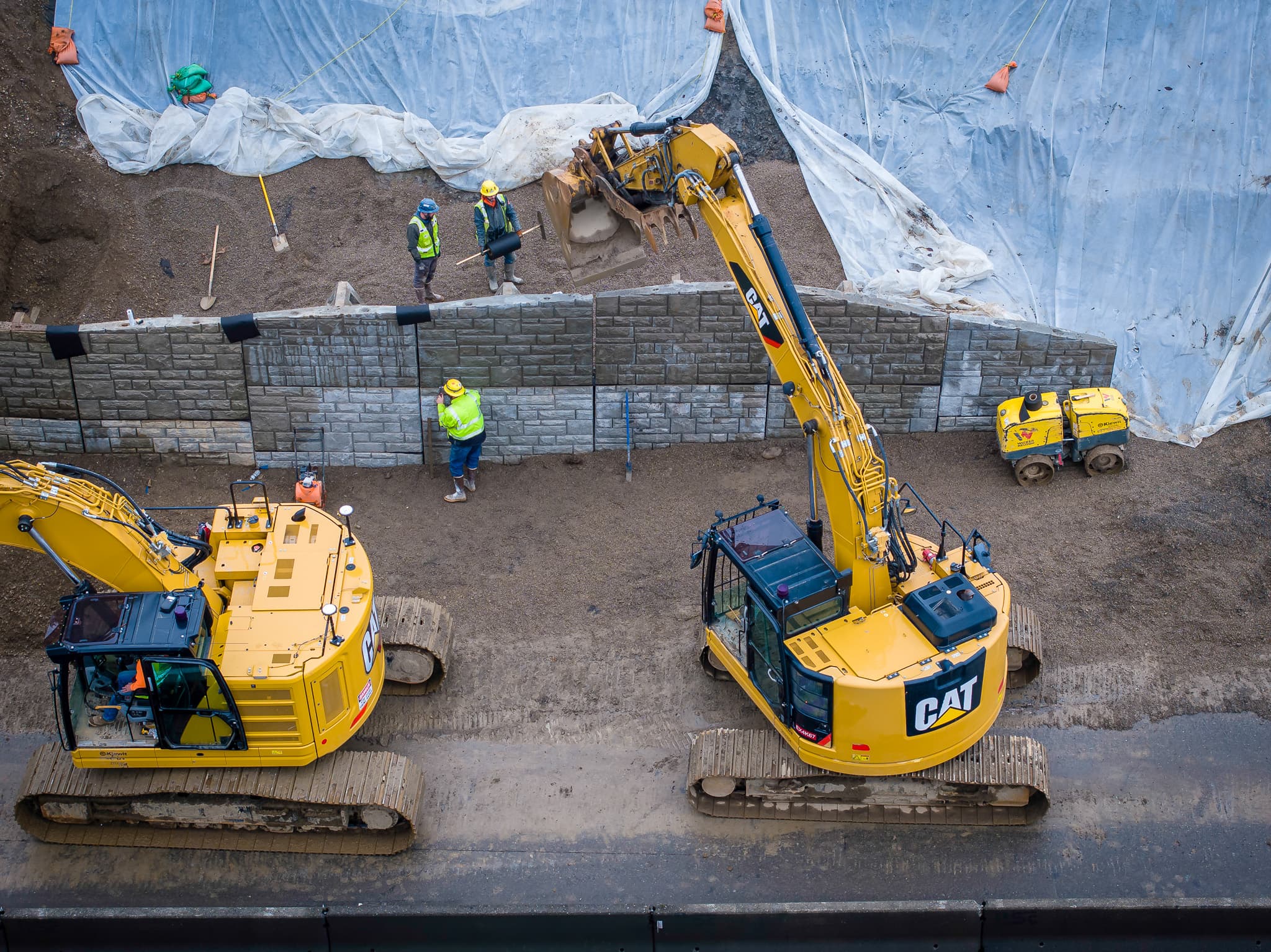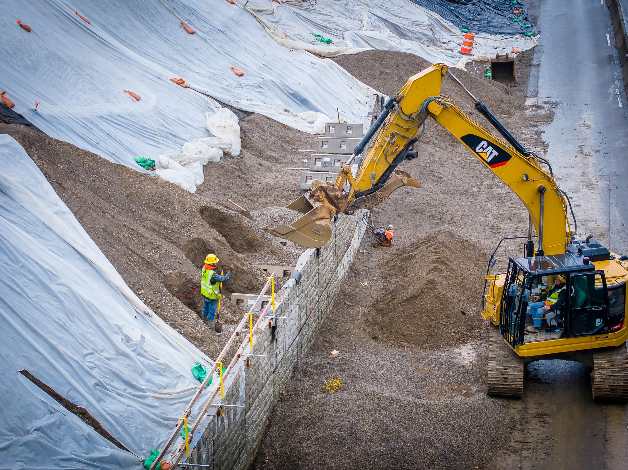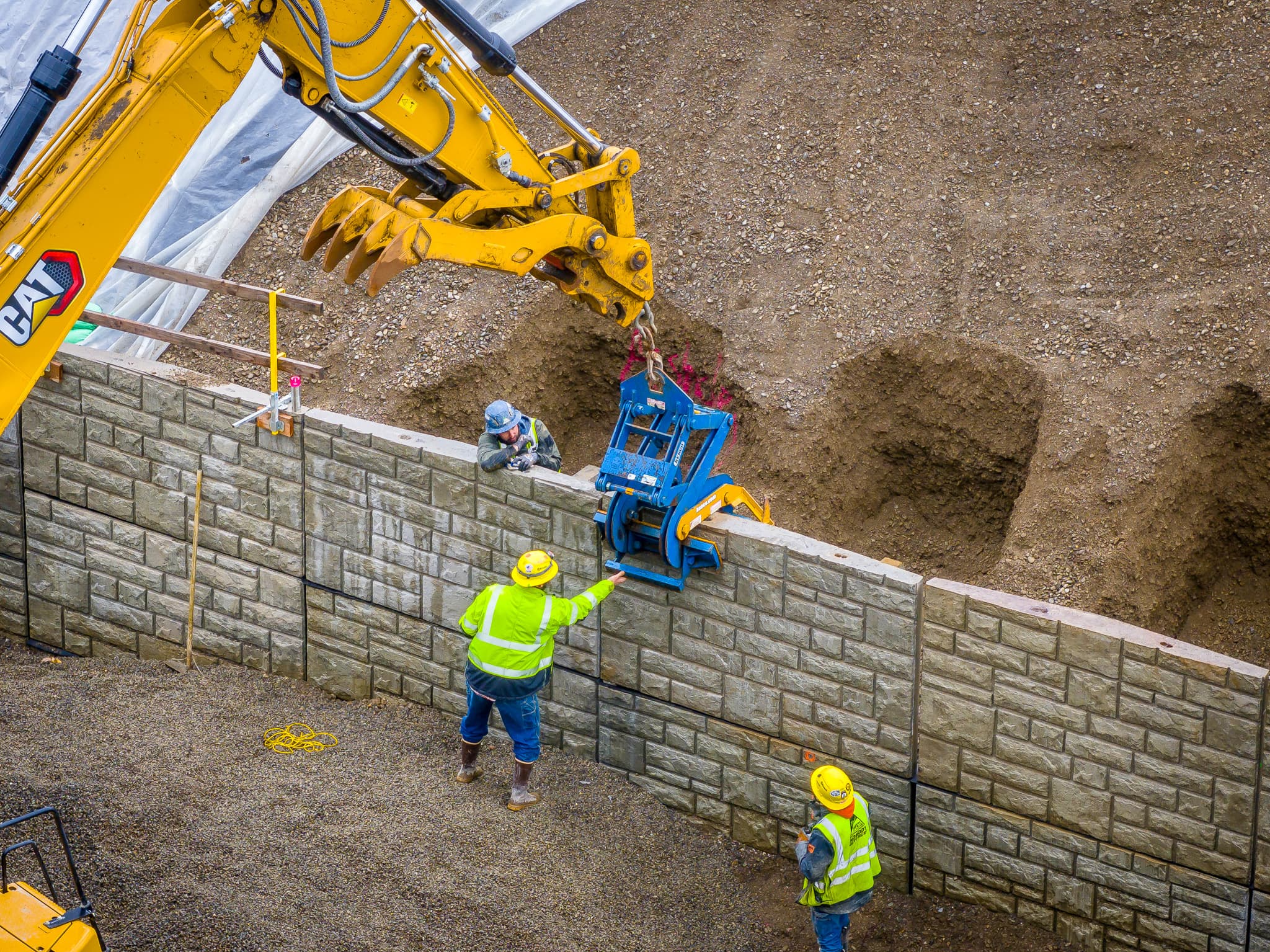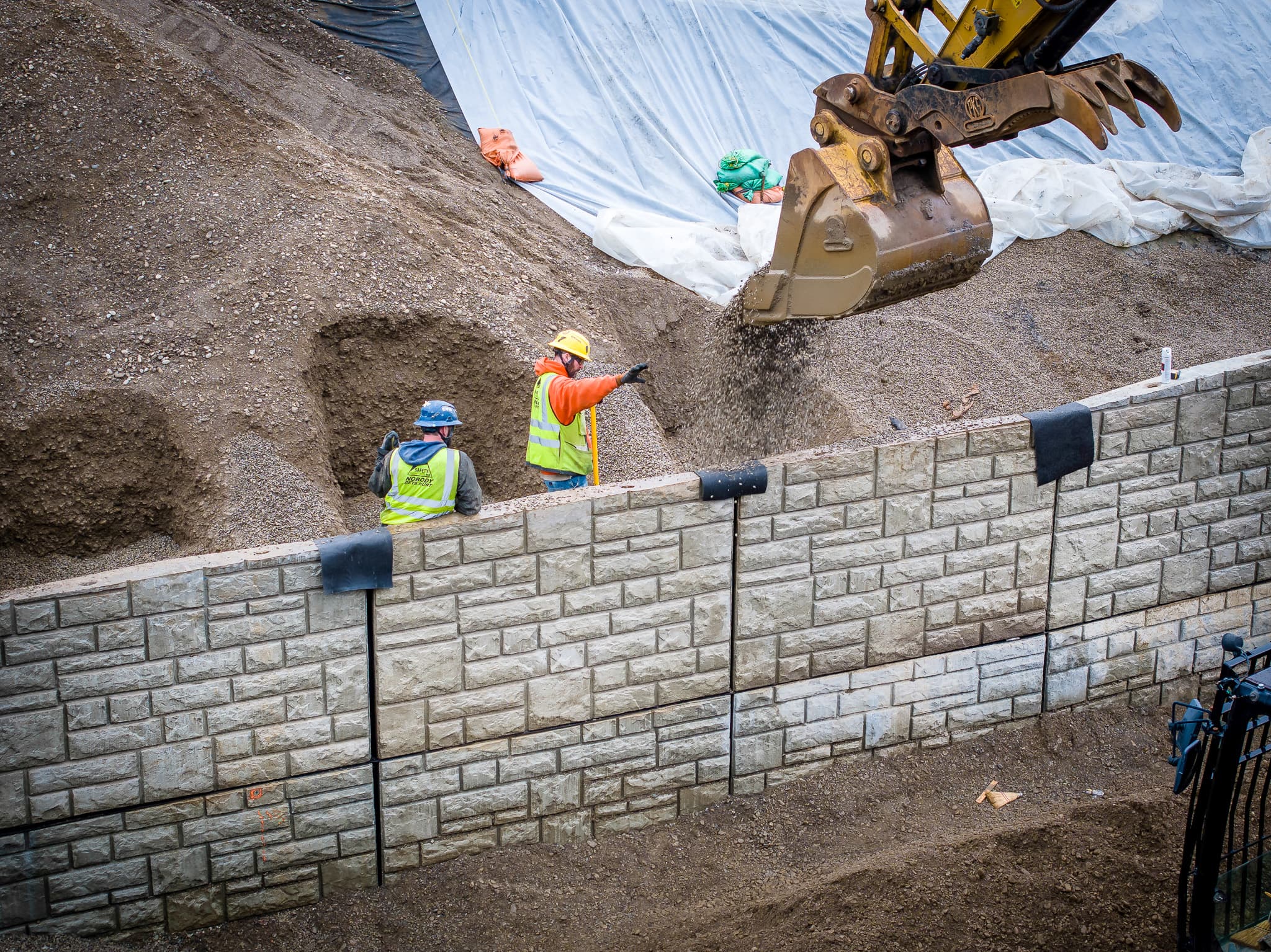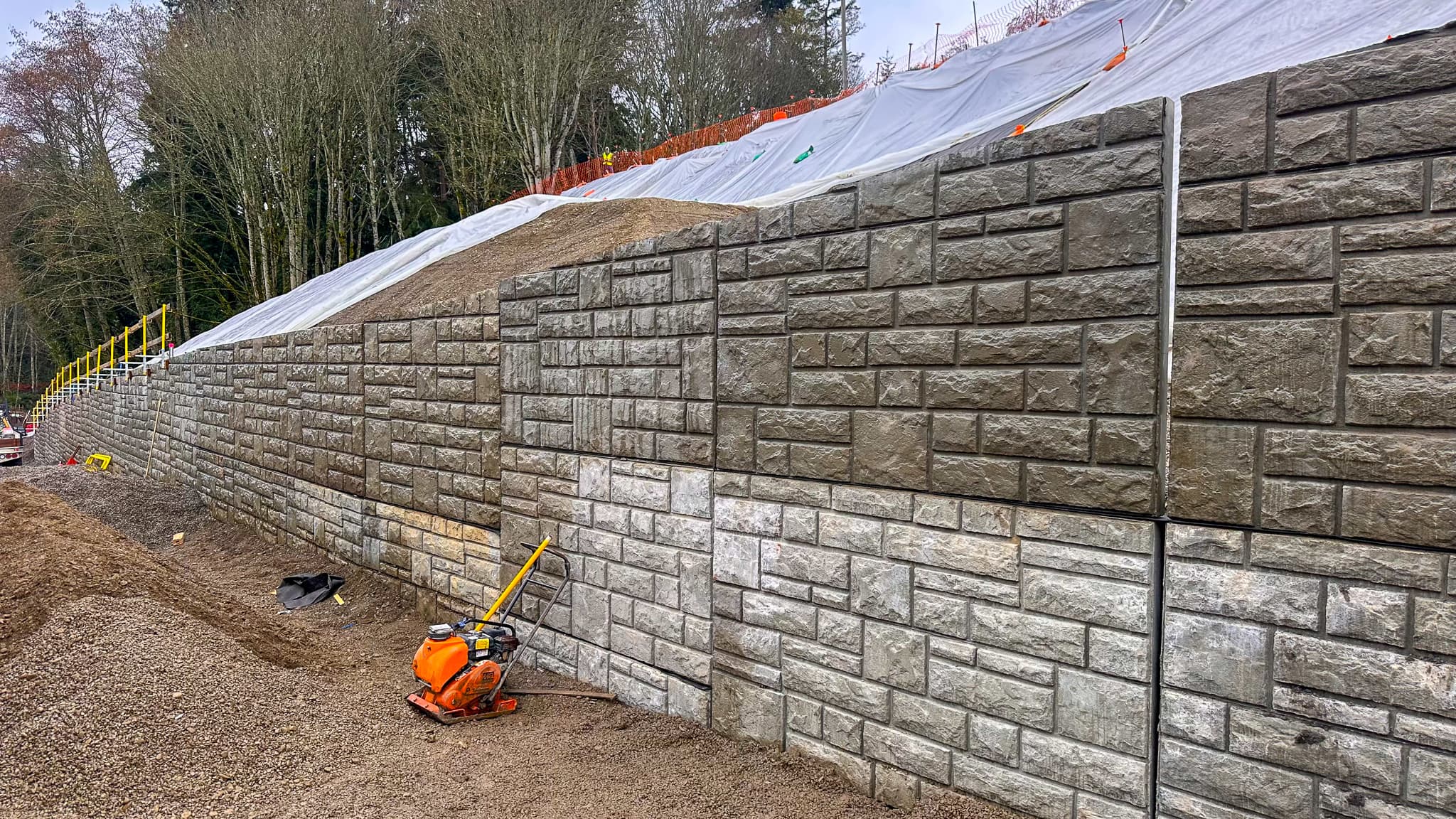 Instead of excavating large volumes of soil to accommodate reinforcement layers, the Gravix system allowed slot construction. Narrow cuts were made, the wall pieces were set, and backfill was placed in smaller, controlled sections. This approach reduced excavation, lowered labor demands, and simplified installation within a tight footprint.