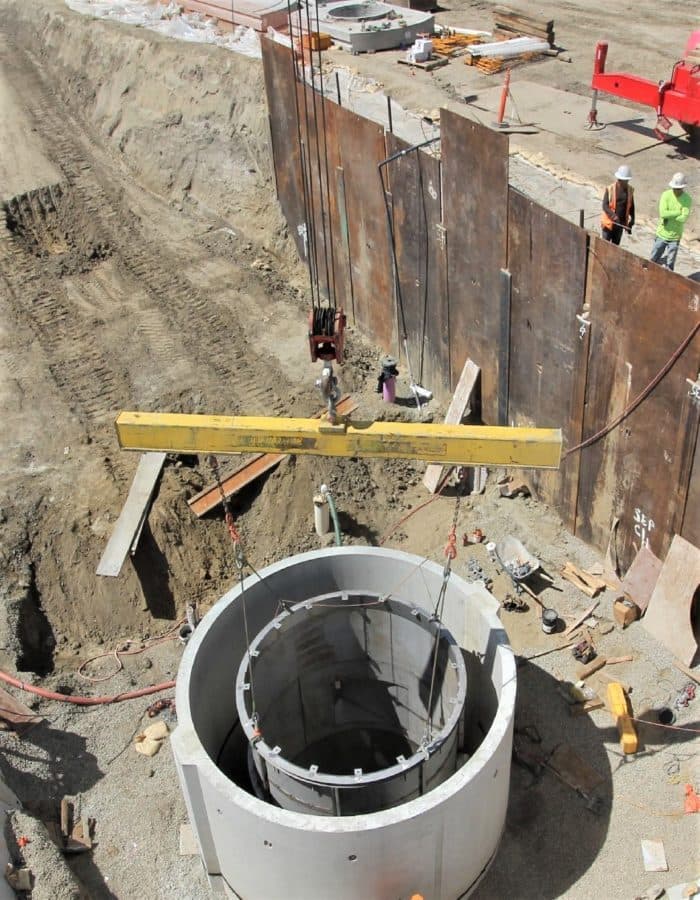 “Mike Bubalo Construction brought Trench Shoring Company, a specialty watering company,” Stein says. “They got control of the water in three days to get above the water table. That’s the beauty of precast concrete. We can get into the bottom of the hole and stack out very, very rapidly, unlike a cast in place structure.”