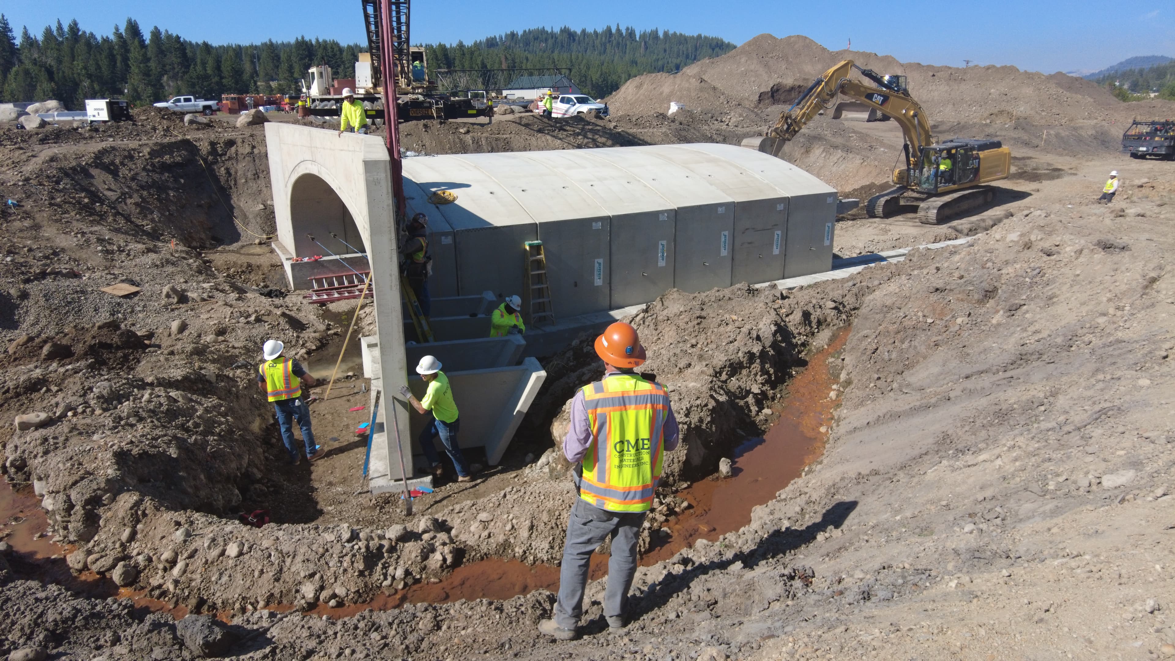 Over four days in high heat Q&D Construction installed 14 arch culvert pieces at 32’W x 6’L x 10’H each across an 82’ span with head walls and wing walls on each end of the culvert. Each piece of culvert was manufactured at Jensen’s Lockeford, California, facility and hauled into the Sierra Nevada mountains on three consecutive days to meet the customer’s deadlines.